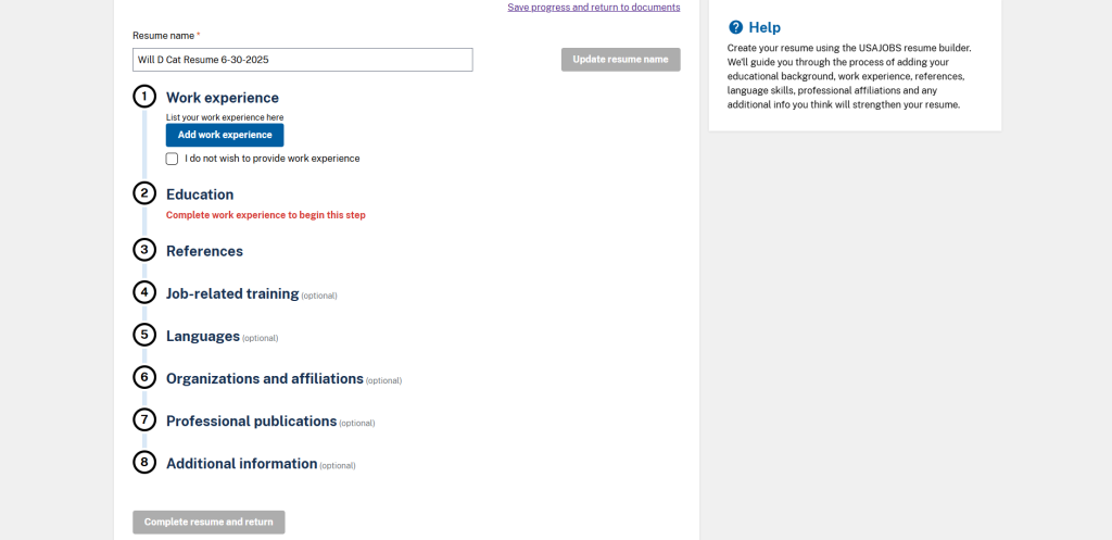 Start inputting your information to start building your federal resume.