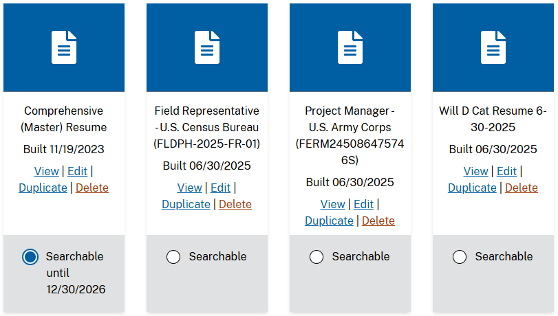 On USAJOBS, you can have up to 5 federal resumes and 10 uploaded supplemental materials (transcripts, certifications, etc.) on the platform at any given time. It is advisable to have a comprehensive federal resume—sometimes called a ‘Master Resume’—to use as a baseline.